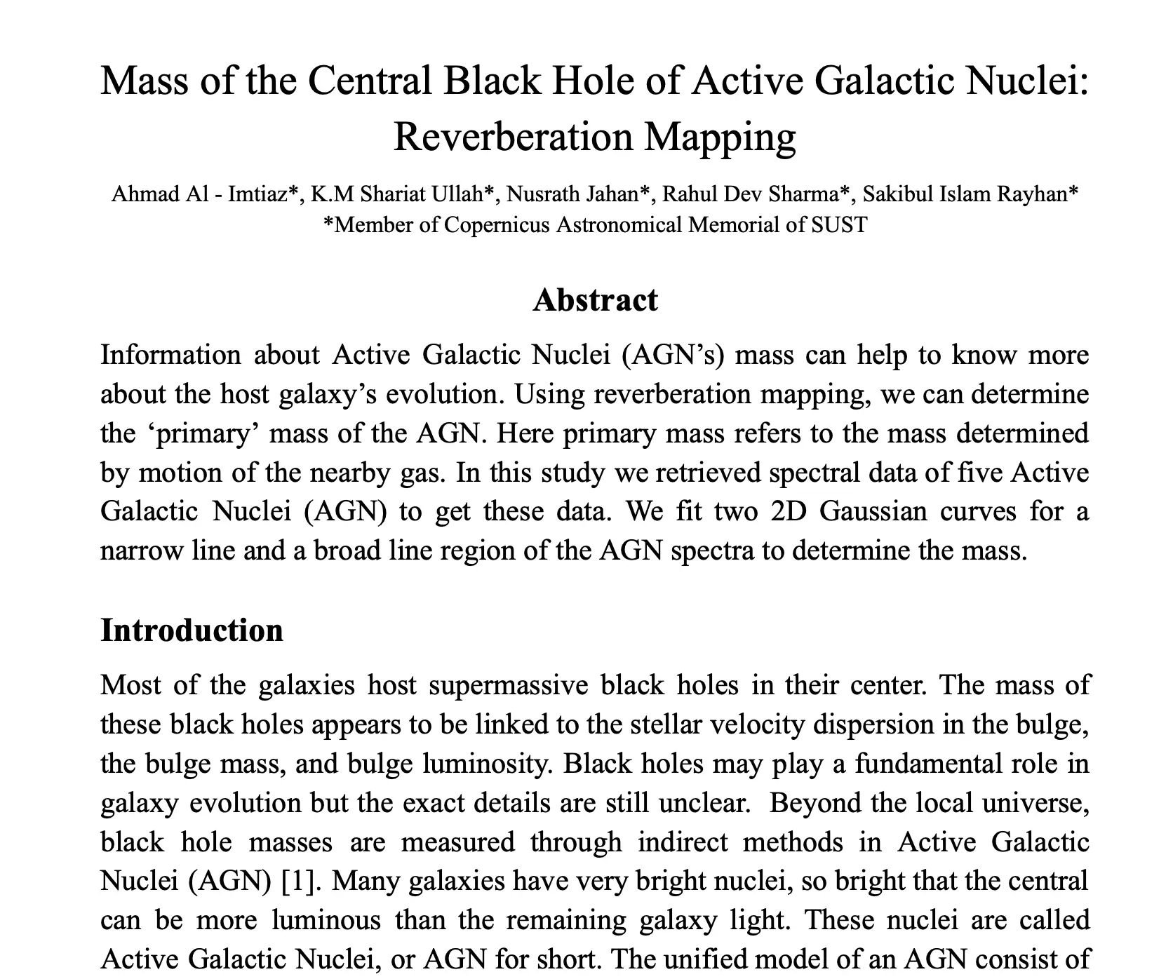 Information about Active Galactic Nuclei (AGN's) mass can help to know more about the host galaxy's evolution. Using reverberation mapping, we can determine the 'primary' mass of the AGN. Here primary mass refers to the mass determined by motion of the nearby gas. In this study we retrieved spectral data of five Active Galactic Nuclei (AGN) to get these data. We fit two 2D Gaussian curves for a narrow line and a broad line region of the AGN spectra to determine the mass.