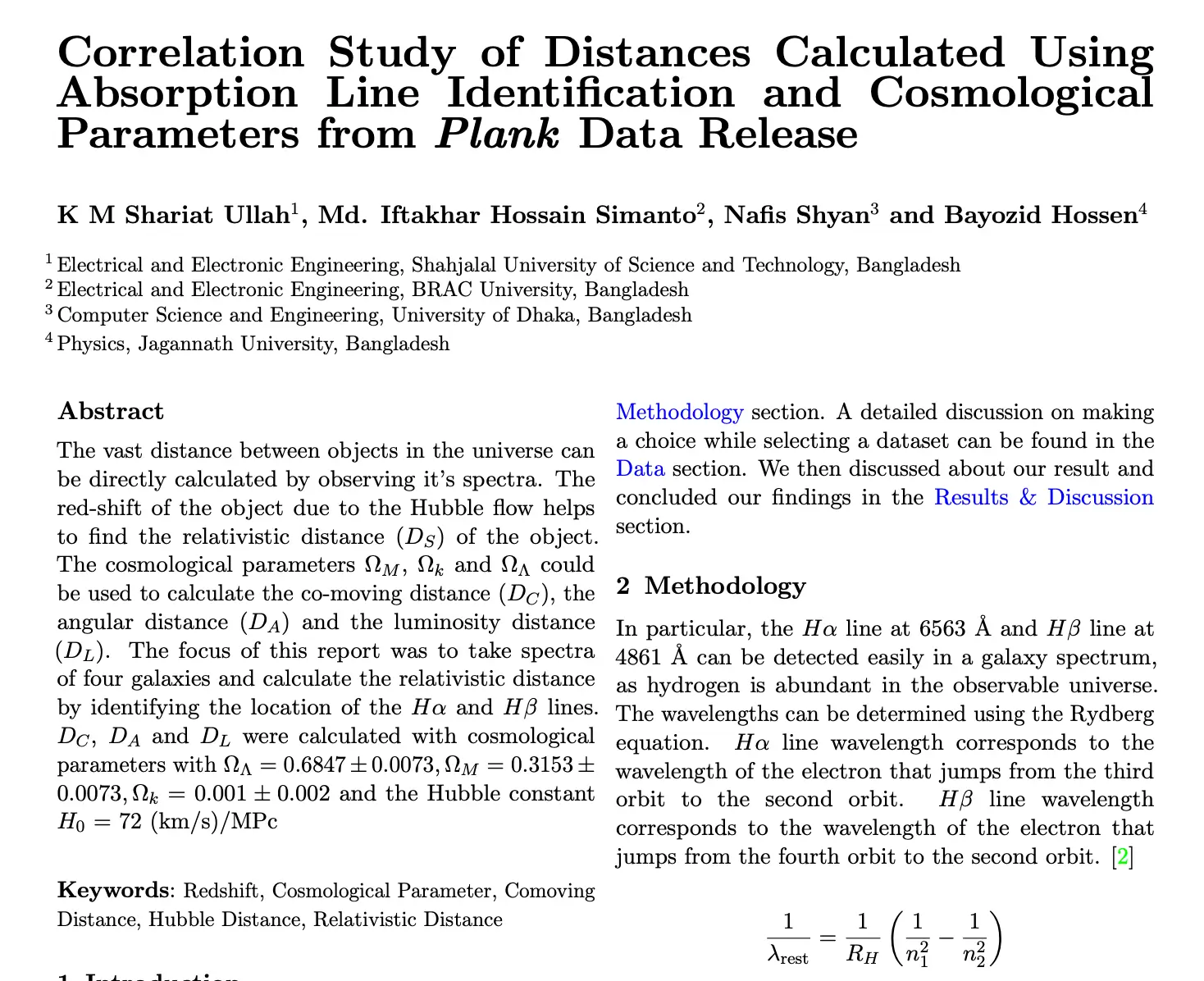 The vast distance between objects in the universe can be directly calculated by observing it's spectra. The red-shift of the object due to the Hubble flow helps to find the relativistic distance (DS ) of the object. The cosmological parameters ΩM , Ωk and ΩΛ could be used to calculate the co-moving distance (DC ), the angular distance (DA) and the luminosity distance (DL). The focus of this report was to take spectra of four galaxies and calculate the relativistic distance by identifying the location of the Hα and Hβ lines. DC , DA and DL were calculated with cosmological parameters with ΩΛ = 0.6847 ±0.0073,ΩM = 0.3153 ± 0.0073,Ωk = 0.001 ±0.002 and the Hubble constant H0 = 72 (km/s)/MPc