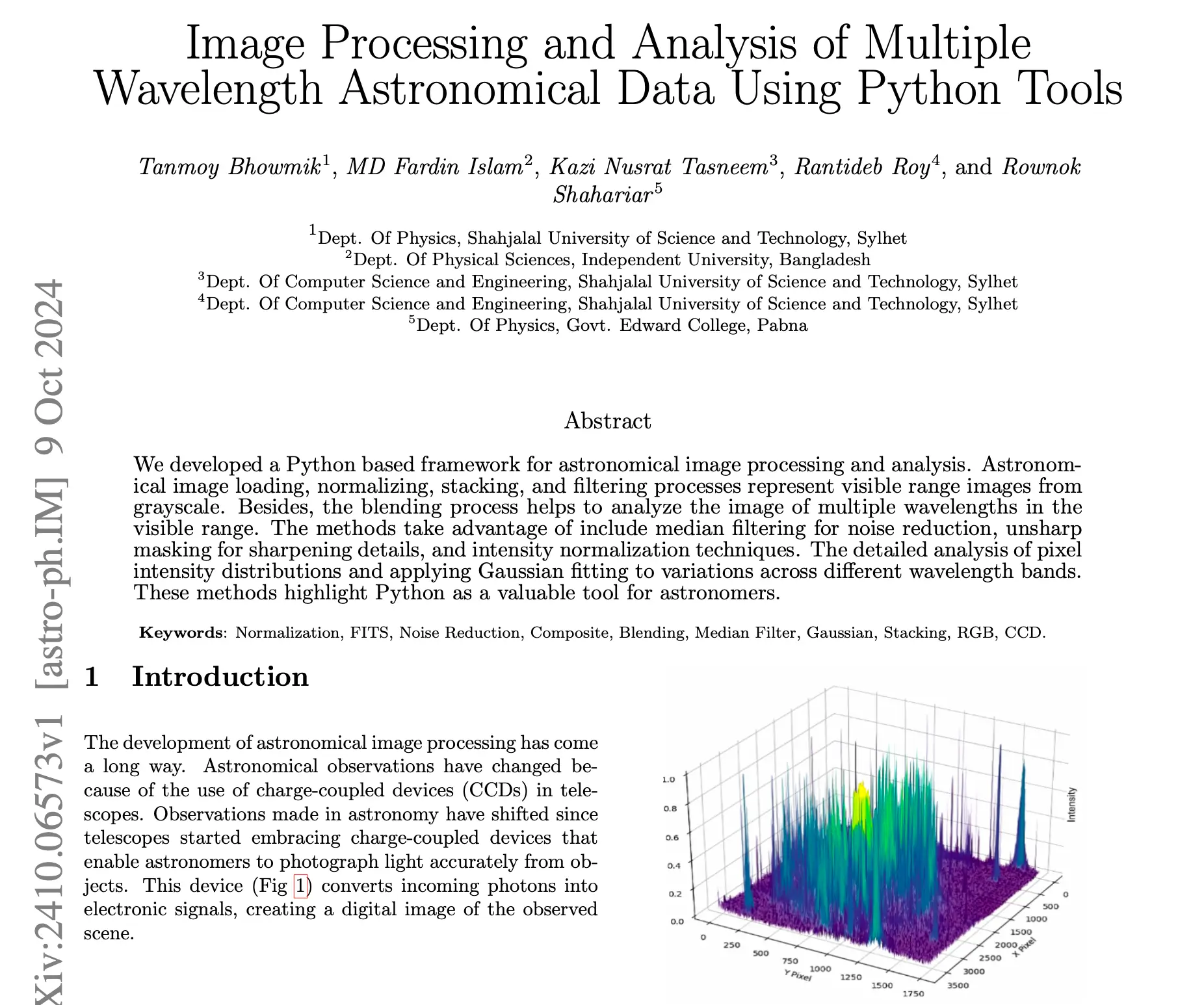 We developed a Python based framework for astronomical image processing and analysis. Astronomical image loading, normalizing, stacking, and filtering processes represent visible range images from grayscale. Besides, the blending process helps to analyze the image of multiple wavelengths in the visible range. The methods take advantage of include median filtering for noise reduction, unsharp masking for sharpening details, and intensity normalization techniques. The detailed analysis of pixel intensity distributions and applying Gaussian fitting to variations across different wavelength bands. These methods highlight Python as a valuable tool for astronomers.